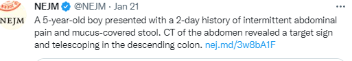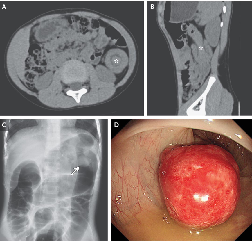 “Colonic intussusception is a rare cause of intestinal obstruction in children, and most cases are ileocolic rather than colocolonic. A pathologic lead point, typically a juvenile polyp, is present in the majority of cases.” In this case, panel D shows a 2.5 cm pedunculated polyp which was thought to be the lead point.