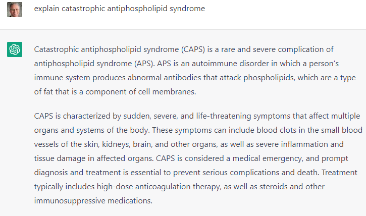 Management of antiphospholipid antibodies: “Thrombotic disease manifestations are important in guiding therapy. For patients with antiphospholipid antibodies and no history of clotting, anticoagulation for primary thromboprophylaxis is generally not recommended…For patients with antiphospholipid antibodies and a history of unprovoked thrombosis (e.g., patients with APS), long-term thromboprophylaxis is recommended…For patients with more severe presentations — such as this patient, who had CAPS with thrombosis in multiple organs — treatment is more aggressive and involves targeting multiple steps within the CAPS cascade.”