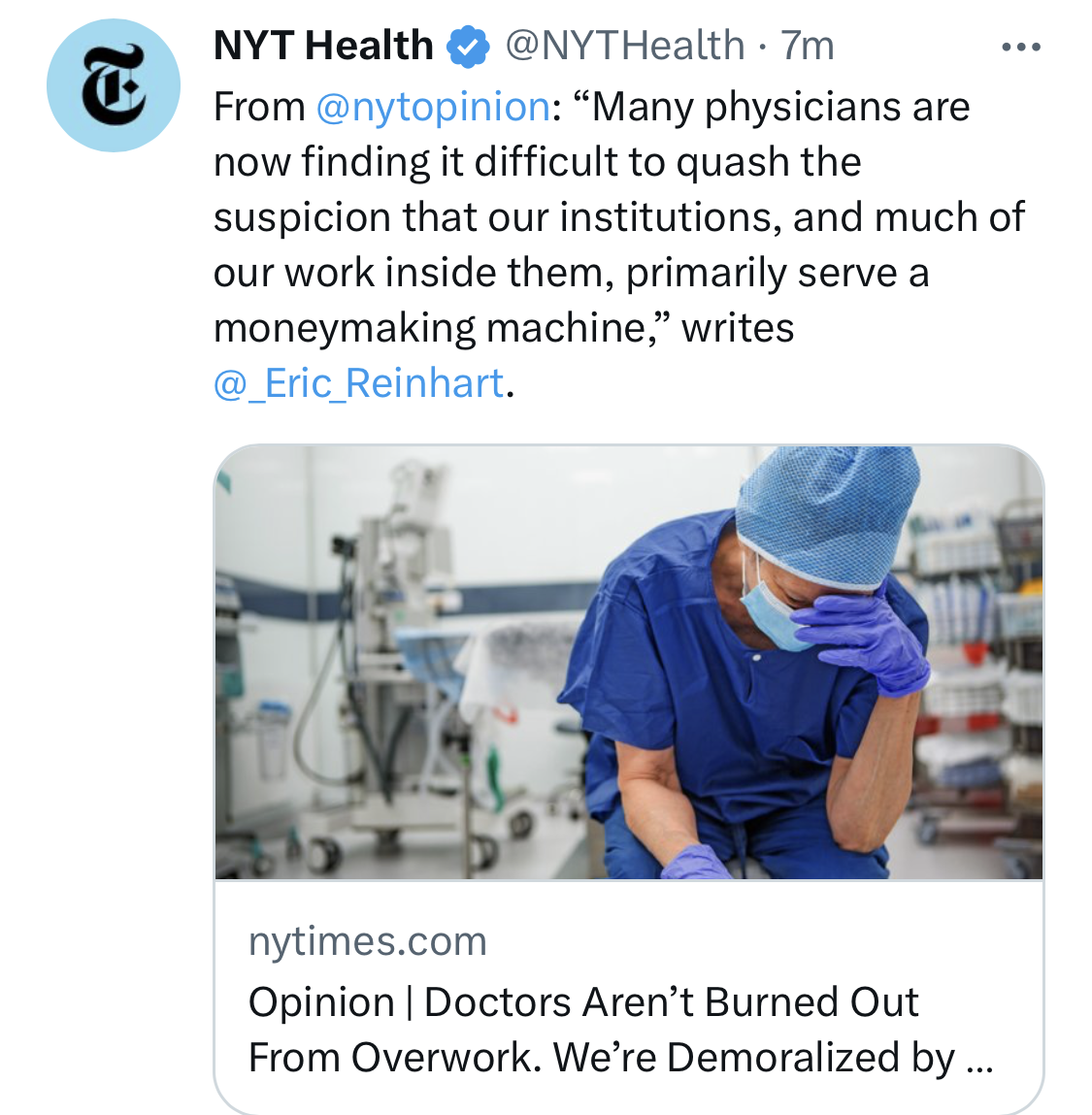 Related article: NY Times, Eric Reinhart 2/5/23: Doctors Aren’t Burned Out From Overwork. We’re Demoralized by Our Health System.
