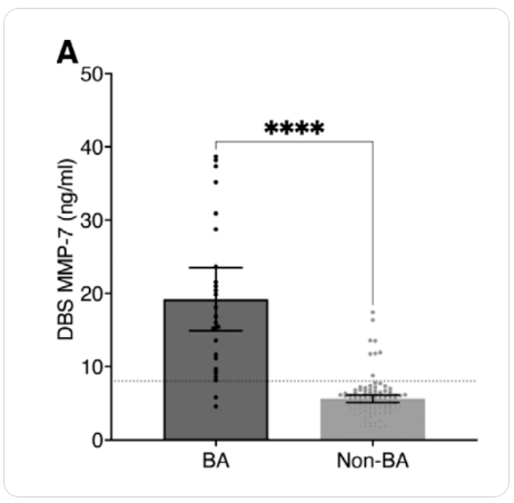 - MMP-7 levels of BA patients on the DBS were significantly higher than those of non-BA patients (19.2 ± 10.4 vs 5.6 ± 2.7 ng/mL, P value < 0.0001).