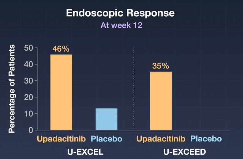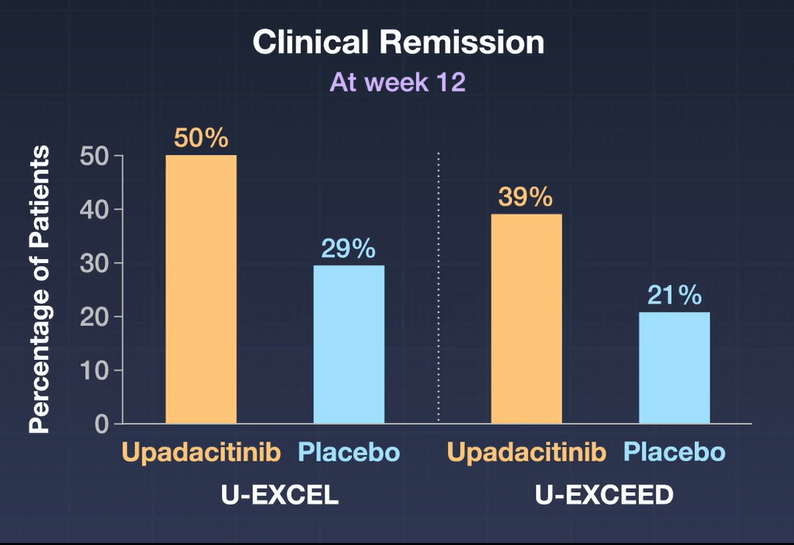- A significantly higher percentage of patients who received 45-mg upadacitinib than those who received placebo had clinical remission (in U-EXCEL, 49.5% vs. 29.1%; in U-EXCEED, 38.9% vs. 21.1%) and an endoscopic response (in U-EXCEL, 45.5% vs. 13.1%; in U-EXCEED, 34.6% vs. 3.5%) (P<0.001 for all comparisons).
