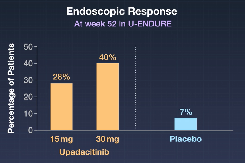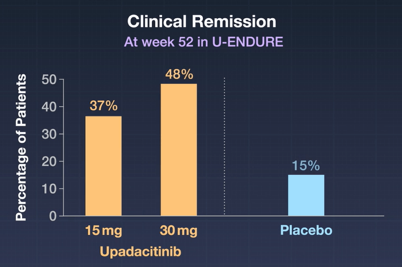 - Maintenance Trial of clinical responders: At week 52 in U-ENDURE, a higher percentage of patients had clinical remission with 15-mg upadacitinib (37.3%) or 30-mg upadacitinib (47.6%) than with placebo (15.1%), and a higher percentage had an endoscopic response with 15-mg upadacitinib (27.6%) or 30-mg upadacitinib (40.1%) than with placebo (7.3%) (P<0.001 for all comparisons).
