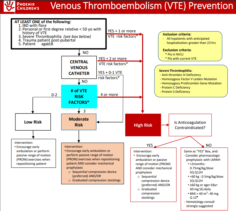 This article provides an algorithm for implementing VTE prophylaxis, recommending prophylaxis if 2 or more risk factors –both IBD and CVCs are risk factors. Mechanical prophylaxis (along with frequent ambulation, if feasible) is generally recommended if there are at least 2 risk factors, whereas anticoagulation prophylaxis is generally recommended if there are at least 4 risk factors. Other risk factors include being post-pubertal, obese, prolonged surgery (>90 minutes) within 2 weeks, altered mobility, and mechanical ventilation (see full protocol in article).