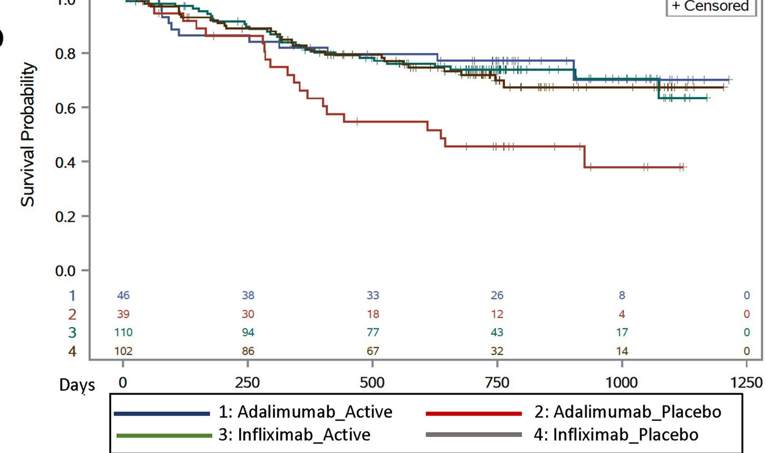 - For treatment failure: among adalimumab initiators, combination therapy was associated with longer time to treatment failure (hazard ratio, 0.40; 95% CI, 0.19–0.81).