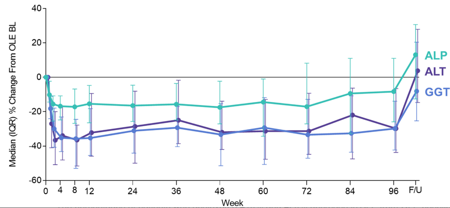 - At week 96, reductions in serum alkaline phosphatase (median, −8.3%), gamma-glutamyl transferase (−29.8%), alanine aminotransaminase (−29.8%), and aspartate aminotransaminase (−16.7%) occurred, and rebounded after 4 weeks of untreated follow-up. Serum cytokeratin 18 M30 and M65 (which are markers of apotopsis and necrosis)were also reduced in the OLE