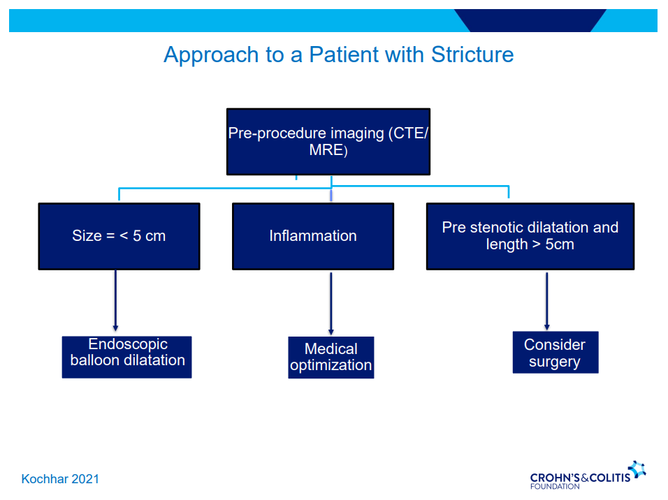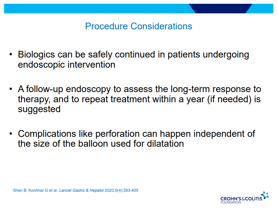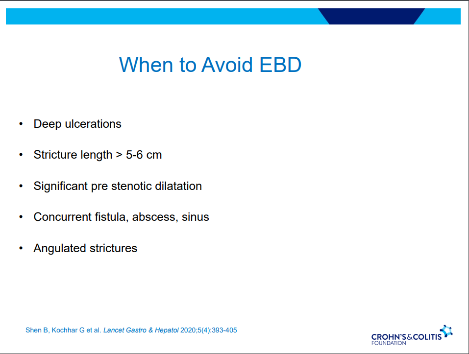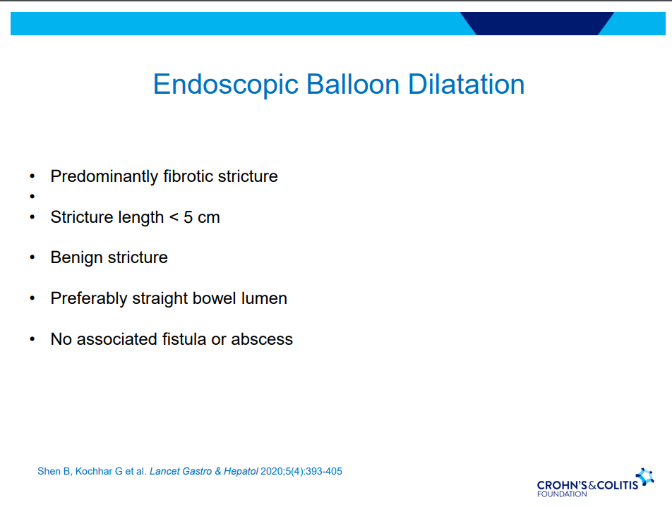 - Endoscopic balloon dilatation in shorter strictures (<5 cm) without associated abscess or fistula (needs imaging prior)