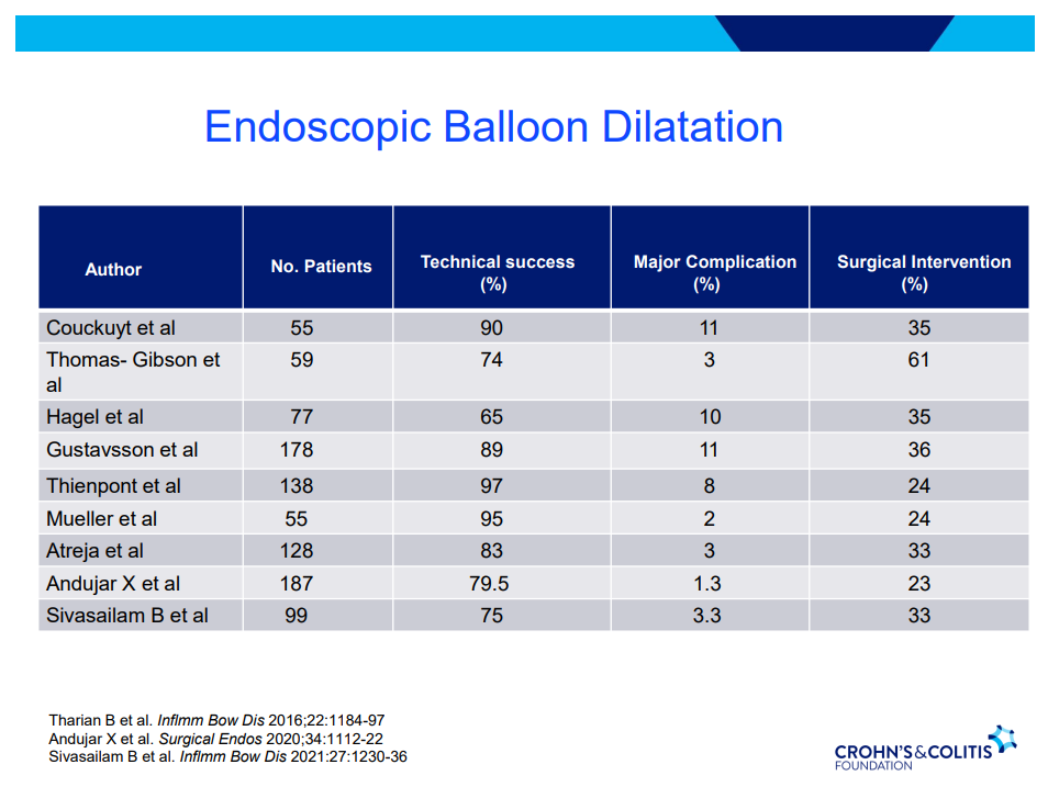 - One-third of balloon dilated strictures will still wind up needing surgery despite dilatation. 5-10% risk of complication. Goal is 15 mm or more (Dr. Schwartz typically does not increase by more than 3 sizes from baseline in one session)
