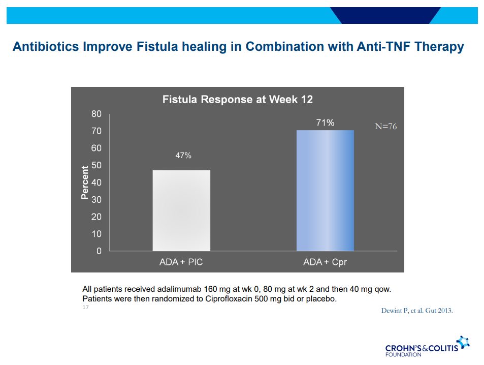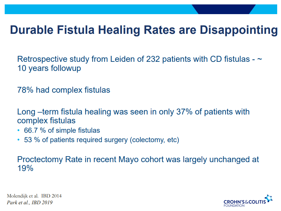 - Ustekinumab and Vedolizumab both had fistula healing rates ~40%