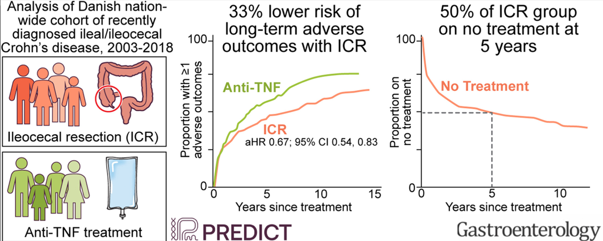 In this study from Denmark (2003-2018) using the Danish National Patient and Prescription Registries, the role of early ileocecal resection (CR), n=581, was compared with anti-TNF treatment, n=698. The primary outcome was a composite of ≥1 of the following: CD-related hospitalization, systemic corticosteroid exposure, CD-related surgery, and perianal CD. Only 178 patients (13.9%) were less than 17 years old. ICR cohort had surgery within 5 months of diagnosis in 85%, and in all within 1 yr of diagnosis. Key findings: