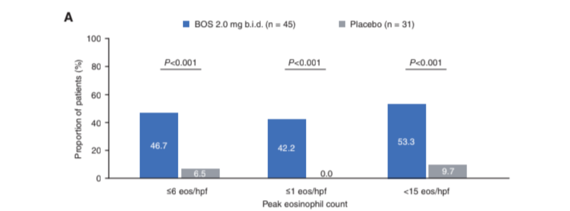 Key finding: Significantly more patients who received BOS (2mg BID) than placebo achieved histologic responses (≤6 eos/hpf: 46.7% vs 6.5%; ≤1 eos/hpf: 42.2% vs 0.0%; <15 eos/hpf: 53.3% vs 9.7%; P < 0.001)