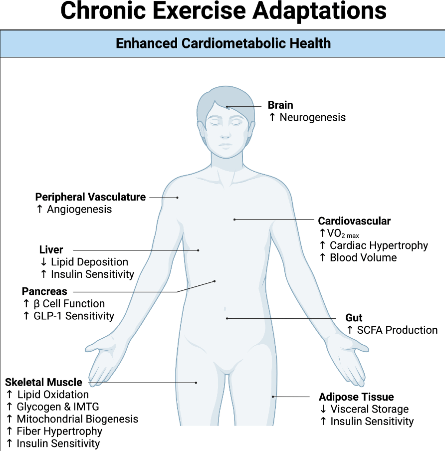 “The risk associated with multiple cancers, cardiovascular disease, diabetes, and all-cause mortality is decreased in individuals who meet the current recommendations for physical activity…Over time, the associated metabolic stress of each individual exercise bout provides the basis for long-term adaptations across tissues, including the cardiovascular system, skeletal muscle, adipose tissue, liver, pancreas, gut, and brain. Therefore, regular exercise is associated with a plethora of benefits throughout the whole body, including improved cardiorespiratory fitness, physical function, and glycemic control. Overall, we summarize the exercise-induced adaptations that occur within multiple tissues and how they converge to ultimately improve cardiometabolic health.”