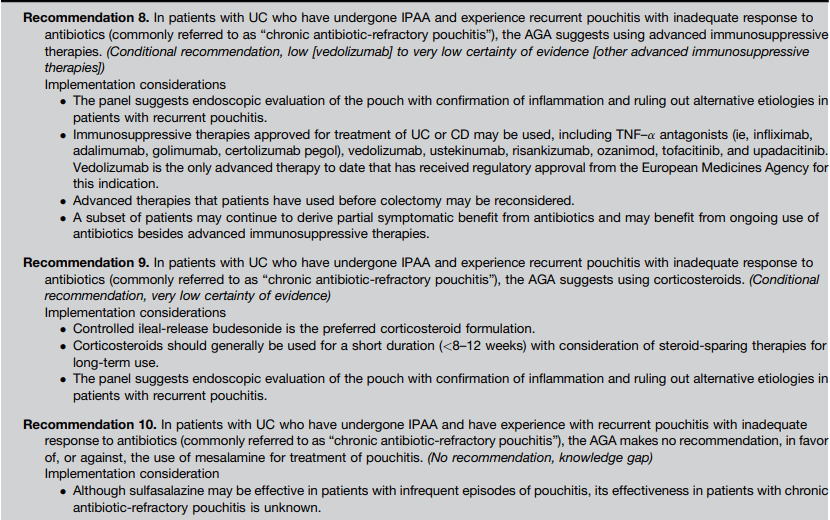 - For Crohn’s-like disease of the pouch, AGA guideline recommends using either ileal-release budesonide or advanced immunosuppressive agents (eg. Biological therapies and small molecule therapies)