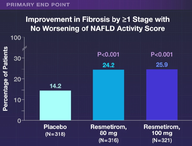 - “Fibrosis improvement by at least one stage with no worsening of the NAFLD activity score was achieved in 24.2% of the patients in the 80-mg resmetirom group and 25.9% of those in the 100-mg resmetirom group, as compared with 14.2% of those in the placebo group (P<0.001)”