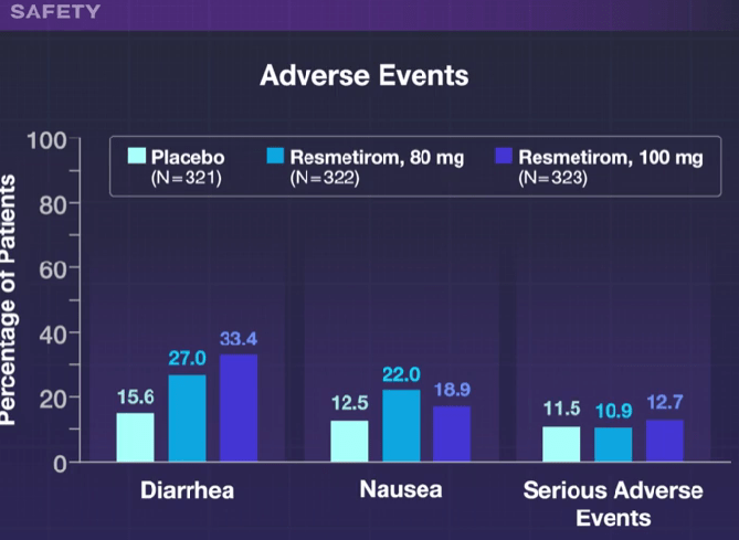 - Diarrhea and nausea were more frequent in the resmetirom group compared to placebo, though there were no differences in serious adverse effects. Patients in the 100 mg group were more likely to discontinue treatment (~7%) compared to 2% in the other two groups.
