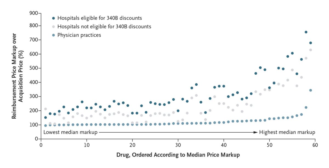 - When we look at high drug costs, much is due to price markups NOT due to the manufacturers (which is already a lot). In this study, hospitals eligible for 340B discounts “retained almost two thirds of insurer drug expenditures, passing on only one third to the drug companies.”