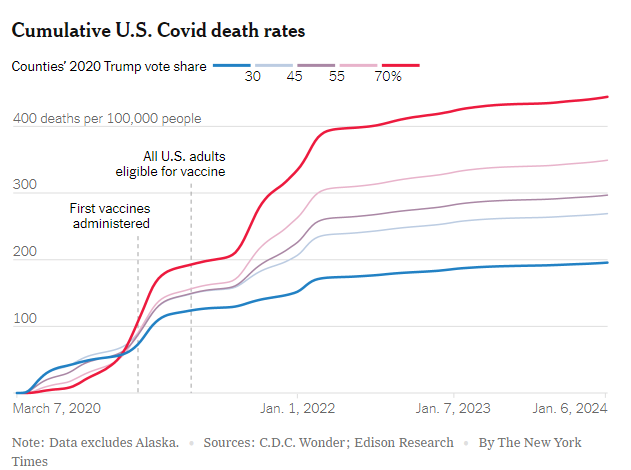 “Many Americans, especially political conservatives, were skeptical of the vaccines despite overwhelming evidence of their effectiveness. To this day, more than 30 percent of self-identified Republicans have not received a Covid vaccine shot, compared with less than 10 percent of Democrats…You can see the tragic effects of vaccine skepticism in this chart.“