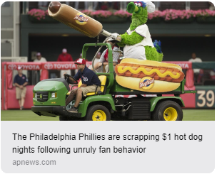 “For more than a quarter-century, Phillies fans considered dollar hot dog night among the best ballpark promotions — but the team has now decided it was the wurst…Armed with projectile frankfurters, some unruly Phillies fans began chucking their favorite Hatfield meat during a game last year, and the dogs soared like cans of corn throughout the stands and onto the field…”
