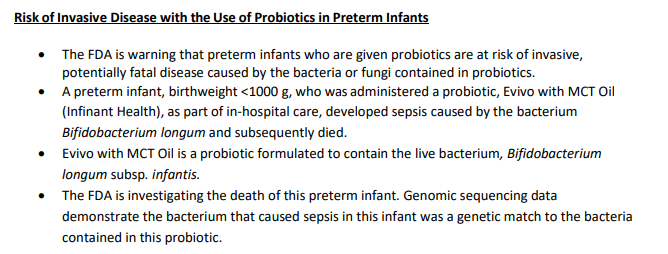 “The FDA cautions that microorganisms contained in probiotics have been reported in the medical literature as causing bacteremia or fungemia, sometimes with a severe clinical course, in very preterm or very low birthweight (VLBW) infants.”