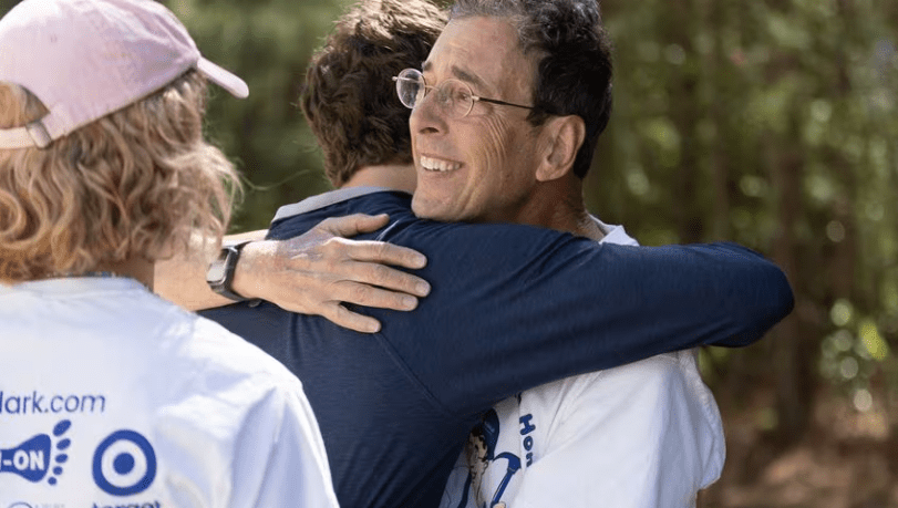 “Clark Howard gets a hug from his son Grant Howard before the start of the Atlanta Habitat for Humanity dedication of the 98, 99, and 100th Howard’s sponsored homes in Atlanta on Saturday, April 13, 2024.”