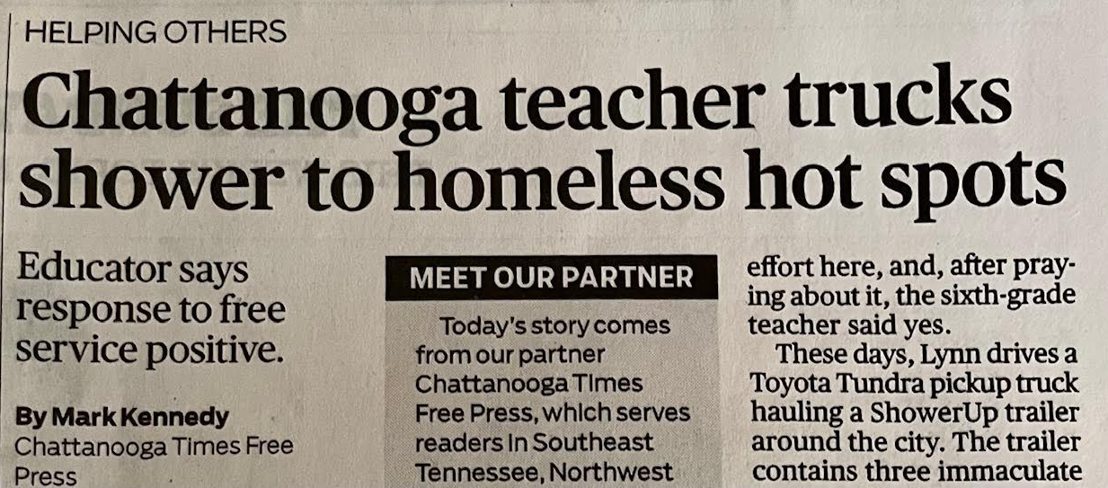 AJC (originally in Chattanooga Times Free Press): Chattanooga teacher hauls shower truck to homeless hot spots