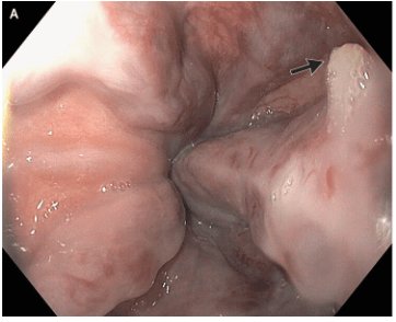 This case reported on a 66 year old with cirrhosis and variceal bleeding. “One varix had a “white-nipple sign” (Panel A, arrow), which indicates recent variceal hemorrhage and results from the formation of a fibrin plug at the site of a resolved thrombus.”