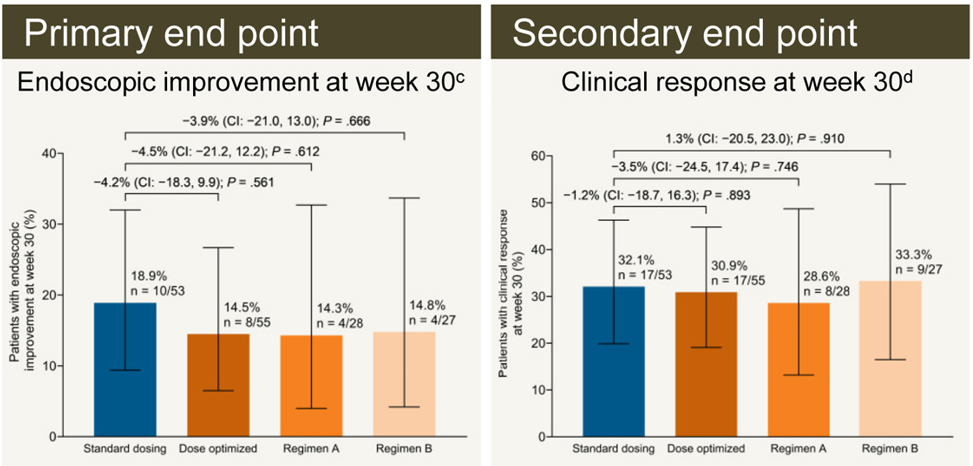 - Endoscopic improvement: 10 patients (18.9%) with standard vedolizumab vs 8 patients (14.5%) with dose-optimized vedolizumab