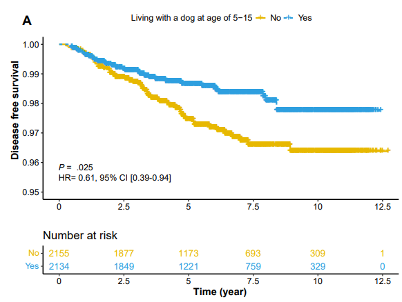- Living with a dog between ages 5 and 15 (hazard ratio [HR], 0.62; P = .034) was associated with decreased CD risk
