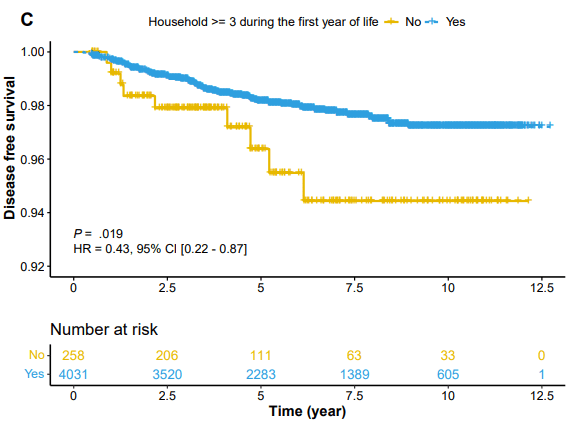 - Living with a large family size in the first year of life (HR, 0.43; P = .016) was associated with decreased CD risk