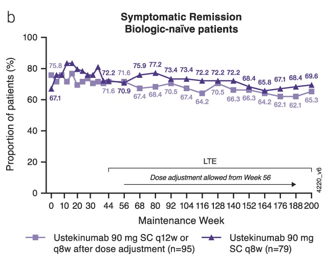 - Of the 348 patients randomized to subcutaneous ustekinumab at maintenance baseline (q8w and q12w combined), 55.2% were in symptomatic remission at week 200.