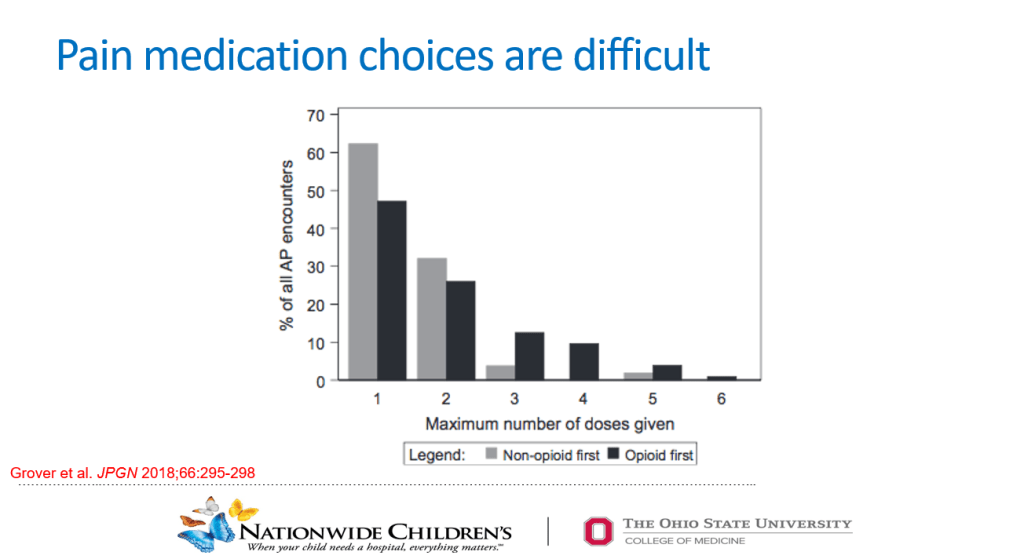 Key points: Even patients with acute pancreatitis need follow-up. Consider using non-narcotic medicines as the first line, especially in patients who have not ‘failed’ these medications.