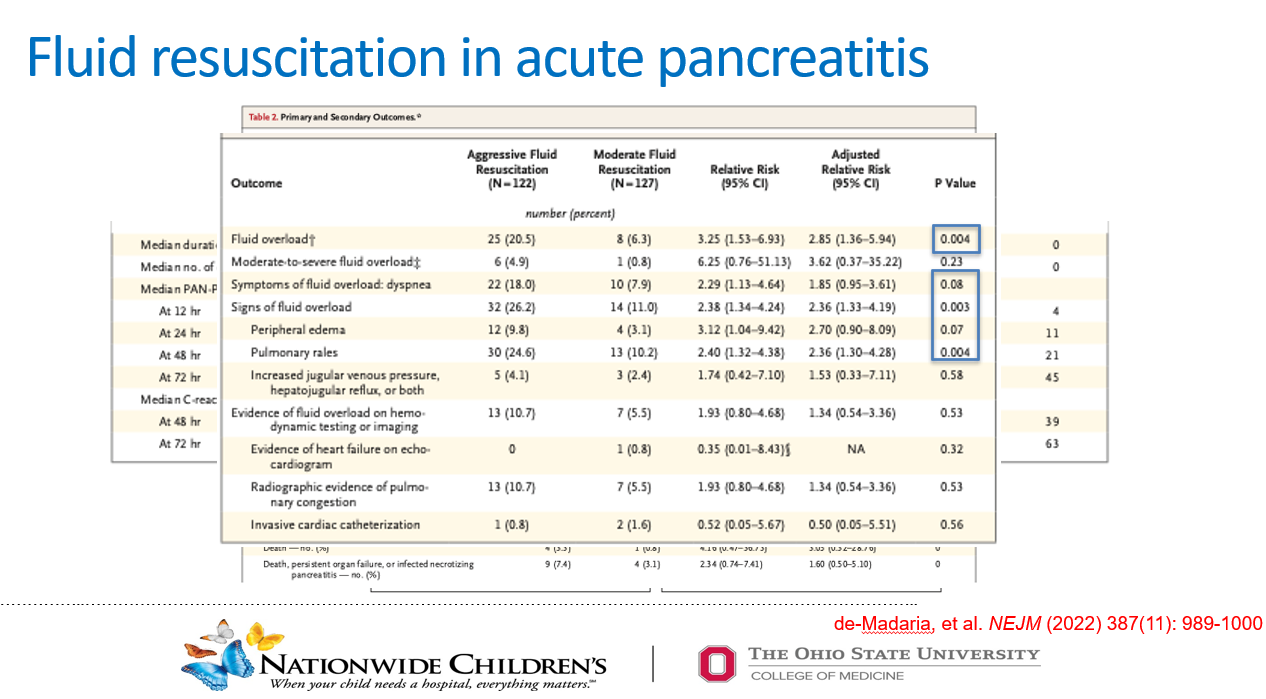 - Aggressive fluid resuscitation of acute pancreatitis in adults is associated with increased risk of fluid overload. Lactated ringer’s is generally fluid of choice.