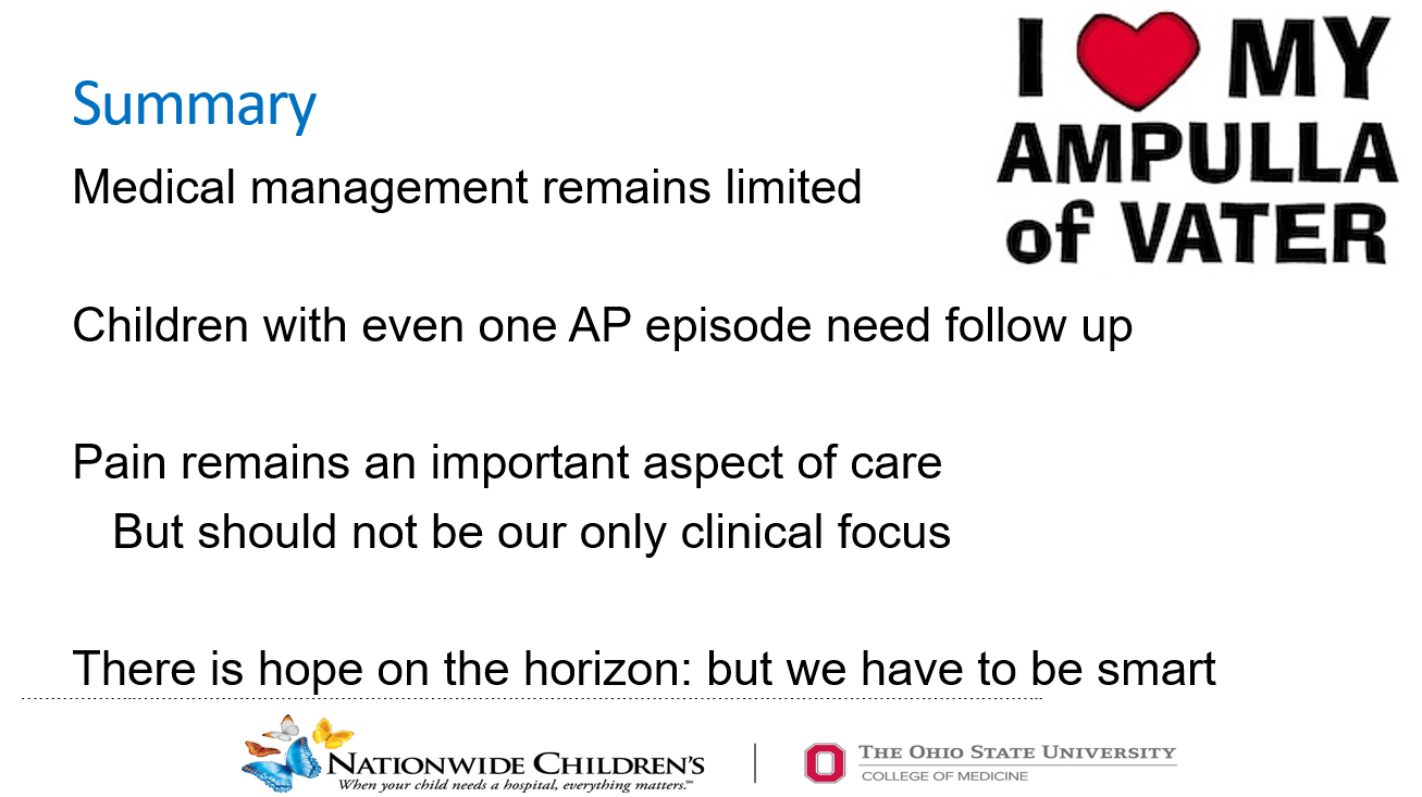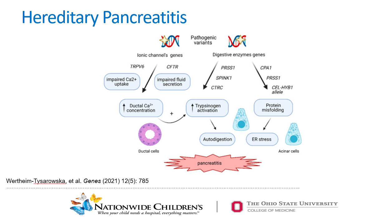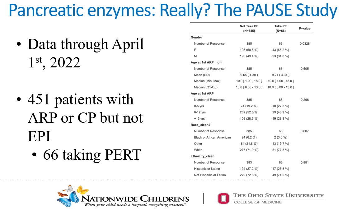 - From Nationwide Children’s Summary: “The researchers found that nearly 17% of children with pancreatic-sufficient ARP and CP were treated with pancreatic enzymes. Children started on pancreatic enzyme therapy experienced fewer AP episodes annually, and approximately 40% of children on pancreatic enzyme therapy had no additional AP episodes [during a mean 2.1 years of follow-up] over approximately two years of follow-up. Children with a SPINK1 mutation and those with ARP (compared with CP) were less likely to have an AP episode after initiating pancreatic enzyme therapy… a randomized, placebo-controlled clinical trial is necessary to evaluate the true impact of pancreatic enzymes for these patients.” Freeman AJ, et al. American Journal of Gastroenterology. 2024 Apr 18. DOI: 10.14309/ajg.0000000000002772. Epub ahead of print.Open Access! Pancreatic Enzyme Use Reduces Pancreatitis Frequency in Children With Acute Recurrent or Chronic Pancreatitis: A Report From INSPPIRE. “After initiation of PERT, the mean AP annual incidence rate decreased from 3.14 down to 0.71 ( P < 0.001).”