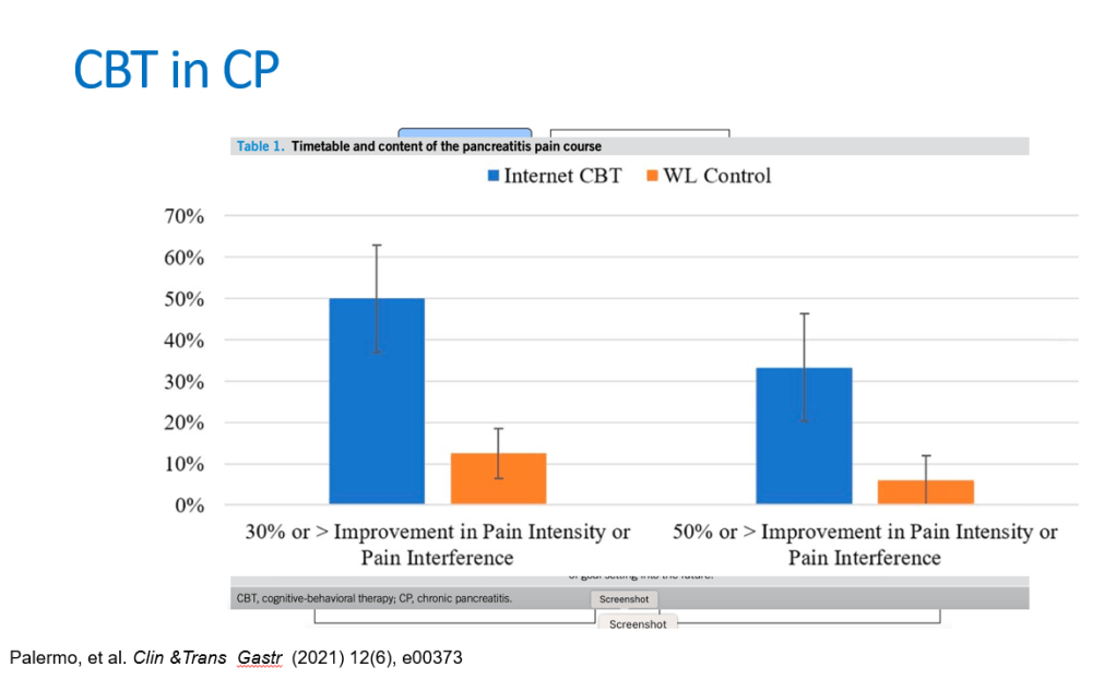 - Cognitive behavioral therapy has been used in chronic pancreatitis with significant improvement