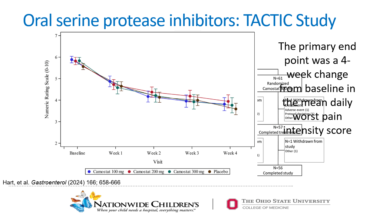 - The TACTIC study showed that an oral serine protease inhibitor reduced daily pain; however, the 4-week change was similar to placebo. This study shows why placebo-controlled studies are needed