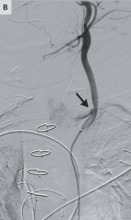 A previously healthy 11-month-old girl presented to the emergency department with a 2-week history of progressively worsening dysphagia and cough..A chest radiograph showed a foreign body with a “halo” or “double-ring” sign. Approximately 10 hours after endoscopic removal, “torrential hematemesis and hemorrhagic shock developed. During emergency surgical exploration, no source of bleeding was initially identified, but intraoperative angiography revealed a fistula between the esophagus, which was dilated, and the left common carotid artery (Panel B, arrow). The artery was ligated, and hemostasis was achieved.” The patient was discharged 32 days after admission without neurologic or functional deficits.