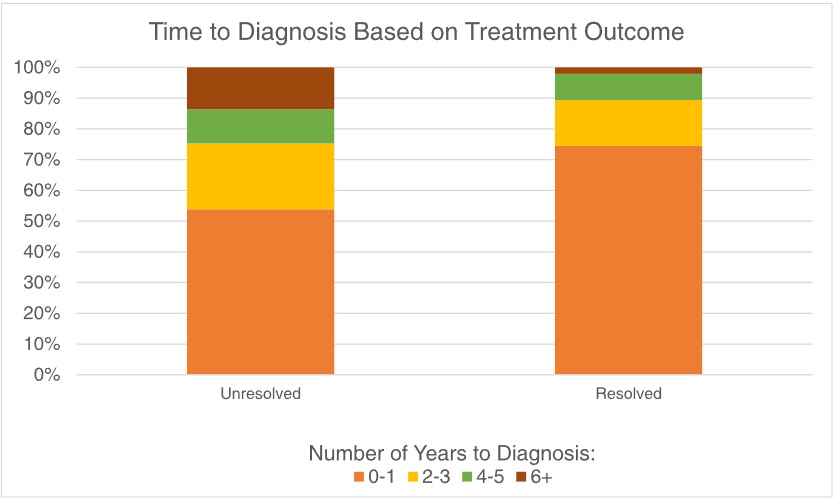 - A longer time to diagnosis was associated with a lower likelihood of symptom resolution after treatment (p = 0.01)