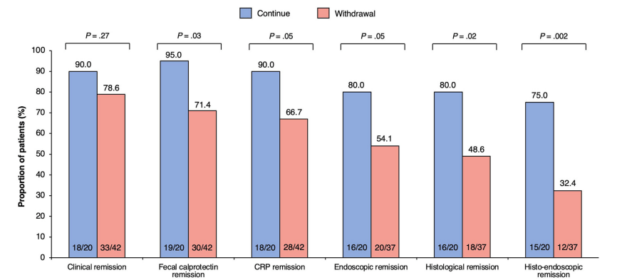- The continue group had significantly higher fecal calprotectin remission (calprotectin <150) (95.0%, 19/20 versus 71.4%, 30/42; P = .03), histologic remission (80.0%, 16/20 versus 48.6%, 18/37; P = .02), and histo-endoscopic remission (75.0%, 15/20 versus 32.4%, 12/37; P = .002) than the withdrawal group. Clinical and endoscopic remission favored the continue group though this did not reach statistical significance.