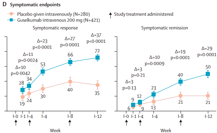 - “Greater reductions in C-reactive protein and faecal calprotectin concentrations with guselkumab induction compared with placebo were observed as early as induction week 4 (first assessed timepoint)”