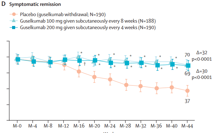 remission at maintenance week 44. Among the 180 patients in the guselkumab groups in clinical remission at maintenance week 44, 124 (69%) of 180 were in endoscopic remission” - “Symptomatic remission and deep symptomatic remission achieved with guselkumab induction was generally maintained to maintenance week 44 with guselkumab relative to placebo”