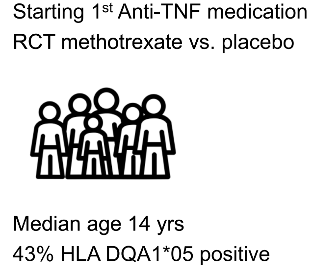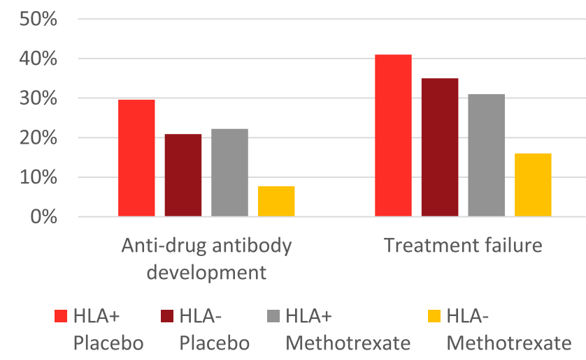 - Rate of ADA: “After further stratification, HLA DQA1*05-negative participants assigned to methotrexate were less likely to develop ADA relative to HLA DQA1*05-positive patients on placebo (odds ratio 0.12; P = 0.008).”