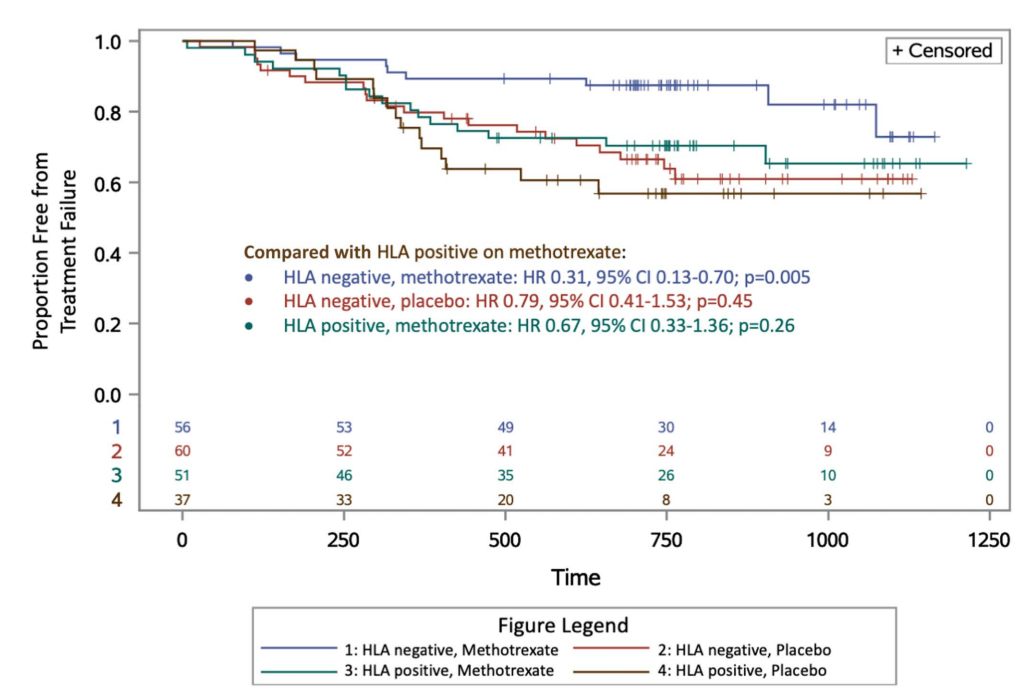 - Methotrexate Combined with HLA DQA1*05 Effect: Patients who were HLA DQA1*05 negative and assigned to methotrexate experienced less treatment failures than HLA DQA1*05-positive patients on placebo (hazard ratio 0.31, 95% CI 0.13-0.70; P = 0.005).