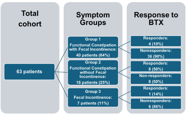 Methods: This was a retrospective, multicenter study including pediatric patients (n=63) who received anal botulinum toxin (BTX) for functional constipation (FC) refractory to medical therapy. Response to therapy was assessed based on improvement in weekly frequency of BM (bowel movements) to 3 or more per week and/or resolution of functional incontinence (FI)