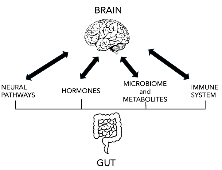 There are 2 types of neural pathways, the “second brain” referring to the enteric (gut) nervous system from the cells that line the intestine and communicate to the vagus nerve to the brain (and in the opposite direction, too). There are also connections via the sympathetic, parasympathetic nervous system (autonomic nervous system, ANS) branches and spinal cord innervation to the gut primarily through the ANS.