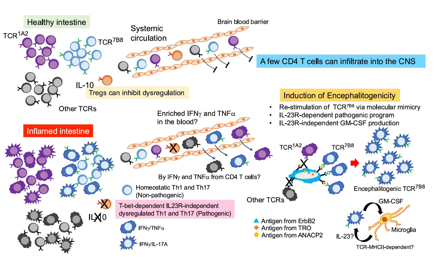 The precise way by which the gut can induce inflammation in the brain has remained unclear. In the journal Nature this week it was shown that inflamed gut-derived CD4+ T cells can infiltrate the brain, leading to neuroinflammation and neurological damage in the experimental model…bacteria derived proteins (antigens) looking like host derived proteins, inciting an immune response.