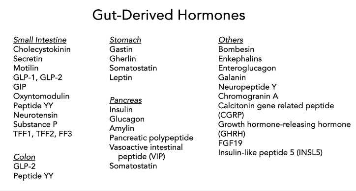 Cells in the gut produce hormones (enteroendocrine cells) such as glucagon-like peptide (GLP-1), gastric inhibitory peptide (GIP), peptide YY, secretin, gherlin, gastrin, and many others. Some of these regulate pancreatic hormones such as insulin, glucagon and amylin, which can be considered as gut hormones but derived from pancreatic cells rather than intestinal lining cells. The hormonal interaction between gut and brain also goes through the hypothalamus-pituitary-adrenal (HPA) axis.