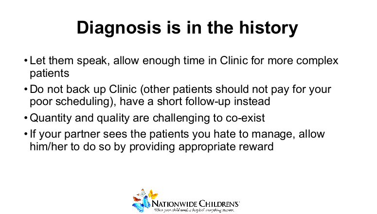 - Make sure the patient is allowed to speak. Parents may embellish (or underreport) symptoms