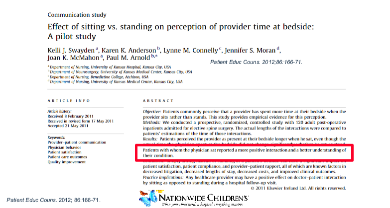 - This extends into the hospital. A recent controlled study showed that having a chair within 3 ft of the bed increased the likelihood that physicians would sit when rounding and increased patient satisfaction (Effect of chair placement on physicians’ behavior and patients’ satisfaction: randomized deception trial. Iyer R, et al.BMJ. 2023 Dec 15;383:e076309). Study conclusion: “Chair placement is a simple, no cost, low tech intervention that increases a physician’s likelihood of sitting during a bedside consultation and resulted in higher patients’ scores for both satisfaction and communication.”