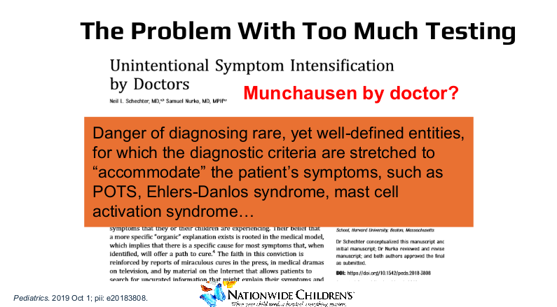 - The problem with too much testing –>it can result in ‘Munchausen by Doctor’ and the discovery of incidental problems (that may not necessitate treatment). Further testing has been associated with intensification of symptoms