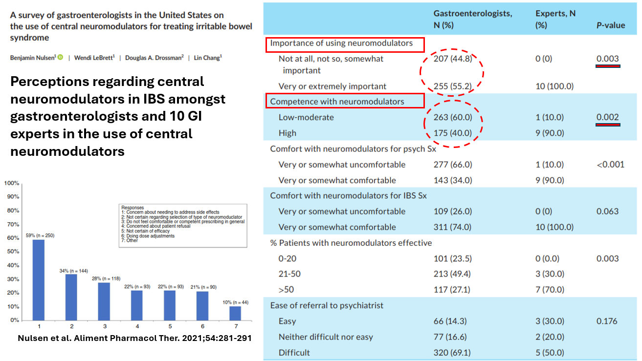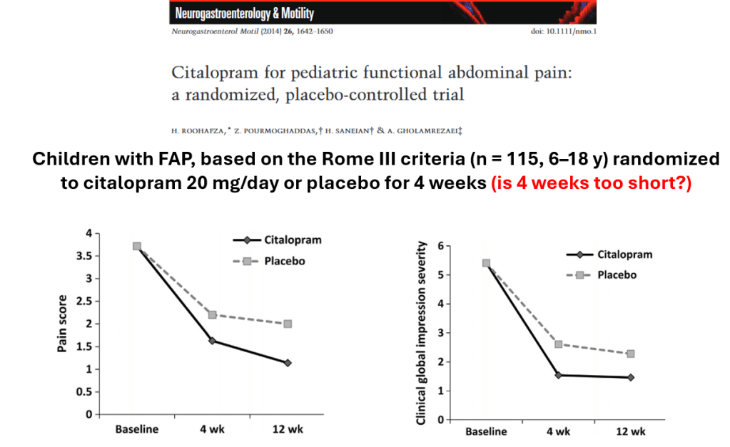 • Psychotropic medications: Amitriptyline is useful for pain predominant IBS, Citalopram often is effective for FAP/IBS with anxiety, Buspirone is helpful in dyspepsia with anxiety, and Mirtazapine is a good choice in the setting of dyspepsia with with weight loss. Generally, start with a low dose and slowly titrate with each medication