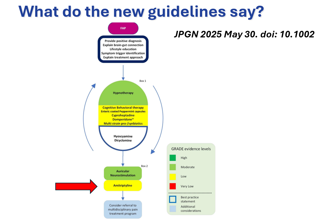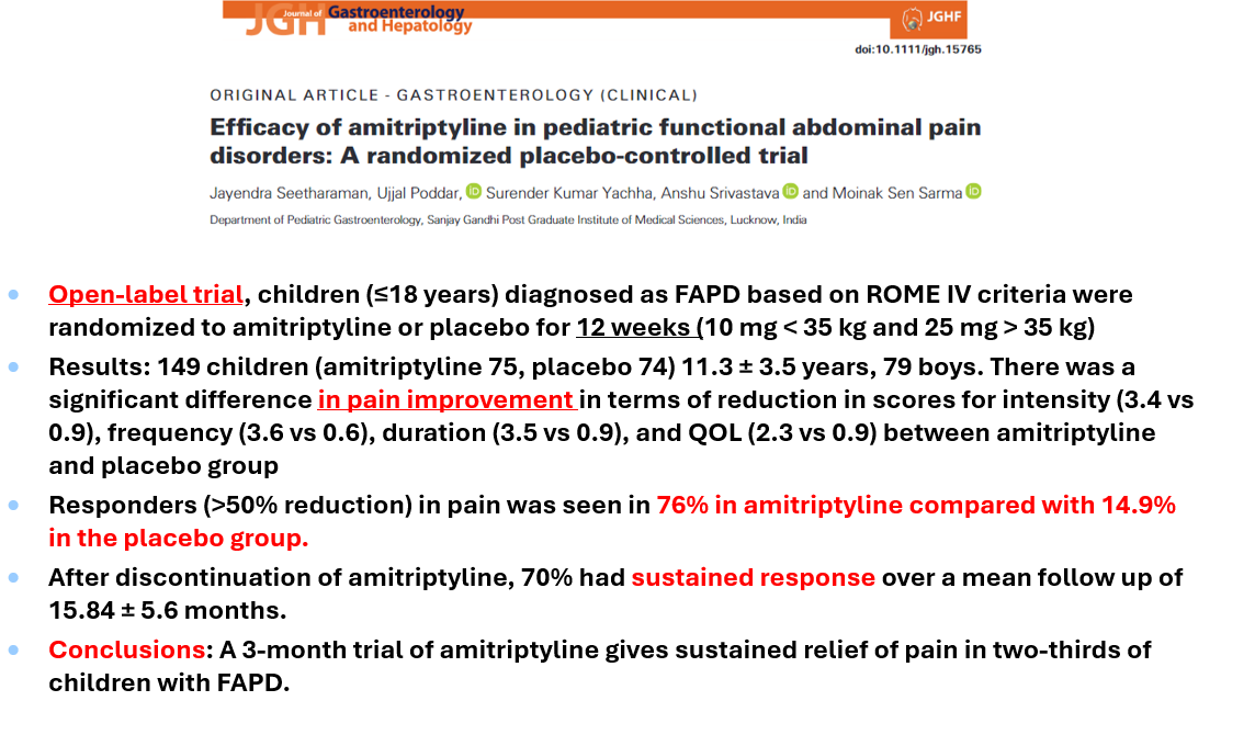 • Amitriptyline is often used for abdominal pain in the absence of anxiety. Variable results have been published
